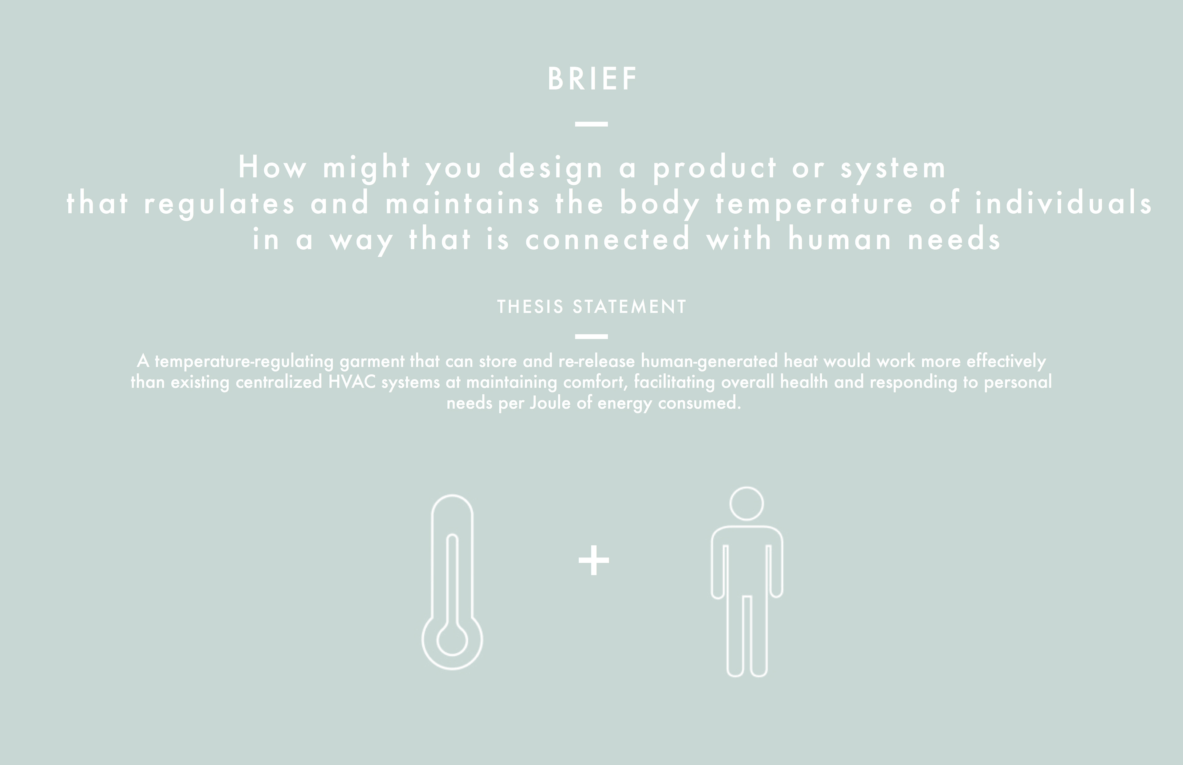 In my day-to-day life I observed unnecessary heat losses and gains over and over again in different environments, age groups, times of the day, times of the year, and locations in the world. I observed family members opening windows during the winter, and then consuming more energy to reverse a room’s temperature back when it became too cold. The current one-temperature-fits-all approach that exists in all of the spaces in the modern world forces us to sit in discomfort and waste energy in our homes and from our bodies. I saw a clear design and engineering opportunity when no functional solution was found to exist that regulates and maintains the body temperature of individuals in a way that is connected with human needs and that reuses lost human resources.