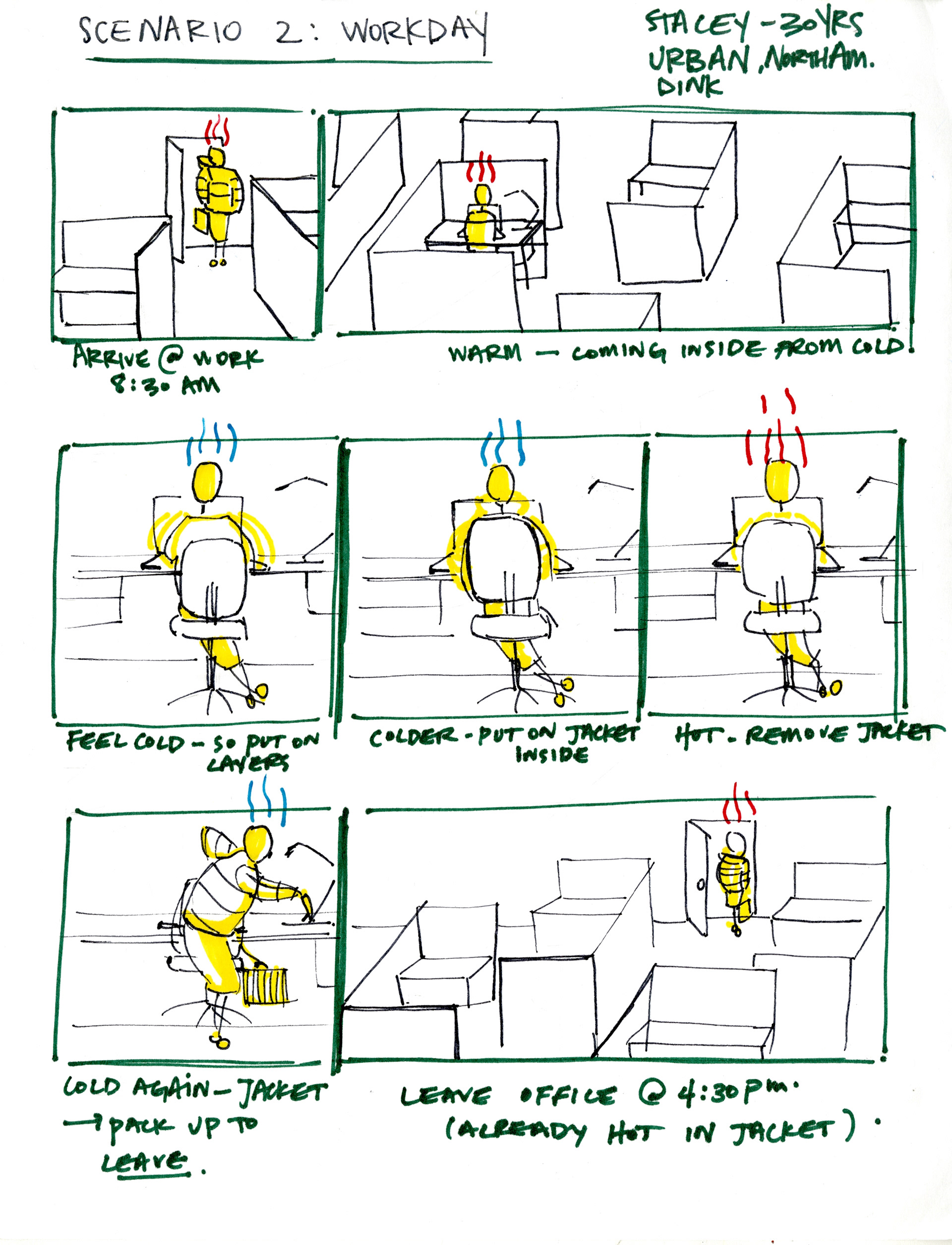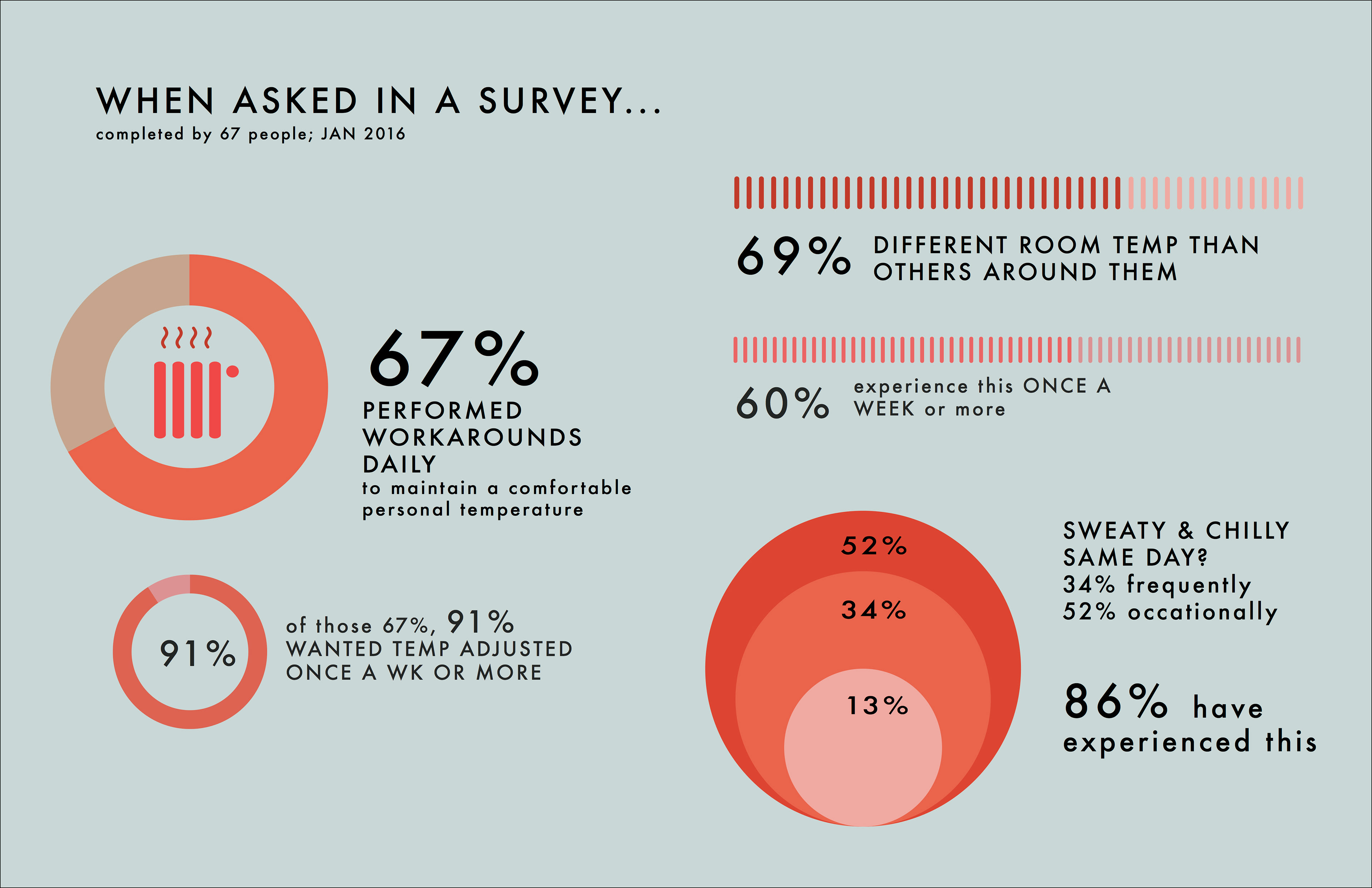 REheat has also considered the office workplace as a secondary context. Many New Yorkers visit the office every day, 5 days a week, approximately 8 hours per day (2015, US Dept of Labor). This secondary environment was chosen because of the number of times it was brought up during interviews with users and in the survey response. Many people found the environmental temperature within the workplace to be either too cold or too hot. Upon further research, according to a New York Times article from August 2015, many women find workplace temperatures either far too cold or too hot because most office buildings are set to temperatures based on the metabolic rates of men. Often for the workplace the thermostat setting is based on what is believed to make workers most productive. The goal of this product will not be focused on productivity, but on personal comfort and health.