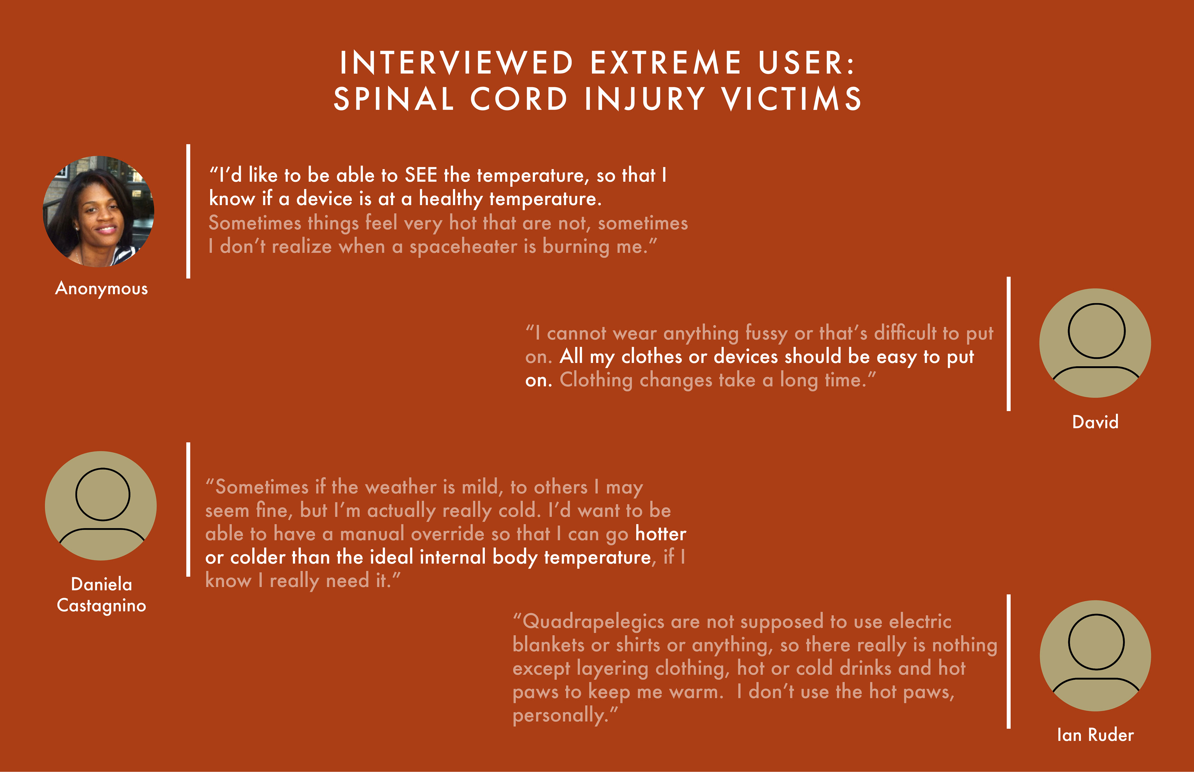 I was able to interview extreme users - people that have experienced spinal cord injuries that have resulted in damage to the autonomic nervous system and therefore to their temperature self-regulation. It is very clear that is no distinct solution exists for their more extreme need for an individualized, personal heating system. All who were interviewed discussed an imperfect series of workarounds to deal with different situations. These workarounds are ineffective, not always available, wasteful and often do not effectively solve the problem. All personalized heating systems (electric blankets or clothing, glove or shoe heated inserts, etc.) were ineffective in some way, or extremely uncomfortable, and were often abandoned. They spoke of embarrassment of overdressing in situations, or for asking for temperatures to be turned to a level that others would find uncomfortable.