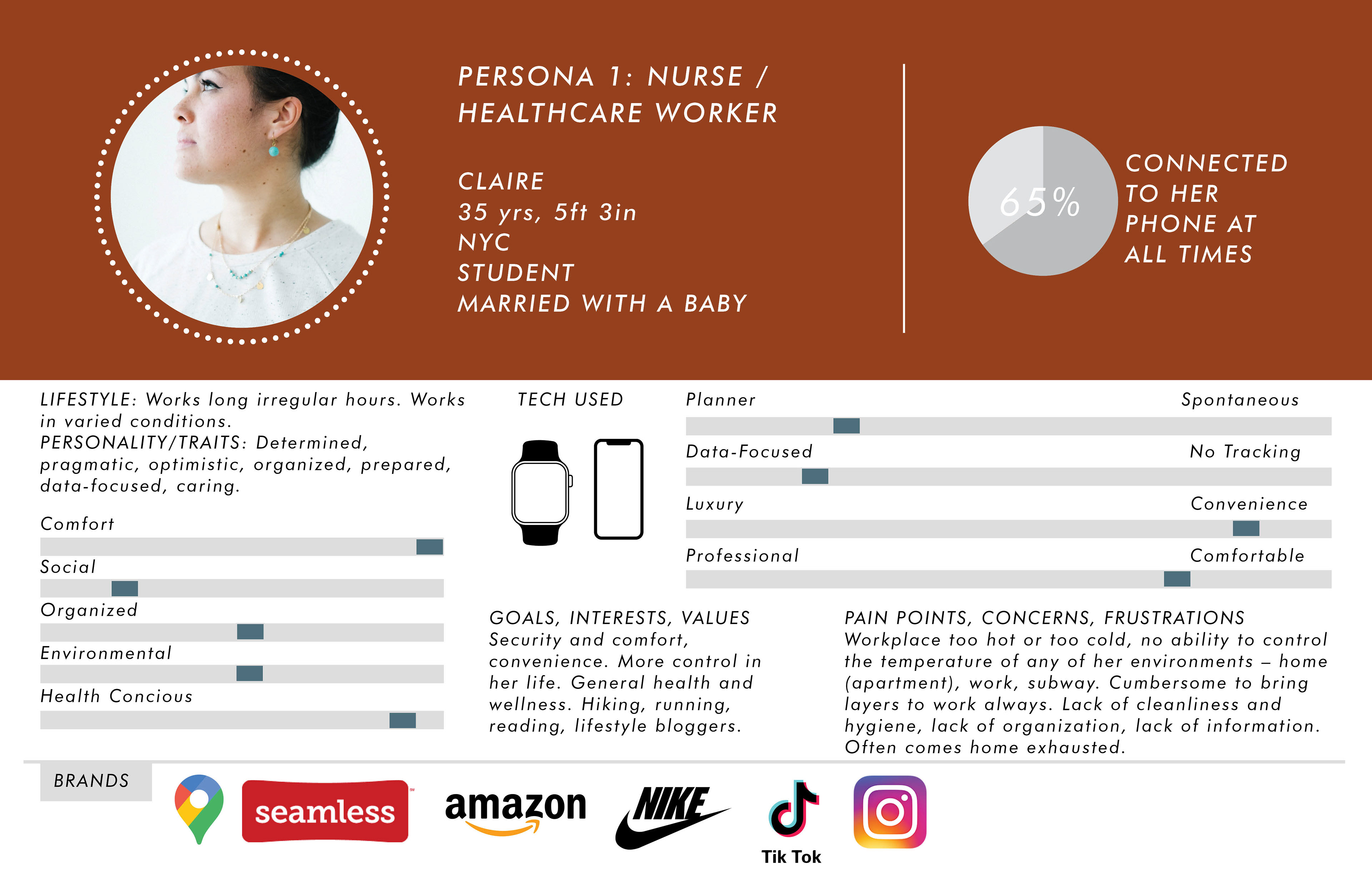The design will focus on adult females between the age range of 18 – 65 years old. The product will be designed for urban locations within North American - specifically New York City. One goal of this project is to have a solution that works seamlessly in the ‘everyday’ urban context, as opposed to extreme environments, such as race-car uniforms or space suits.