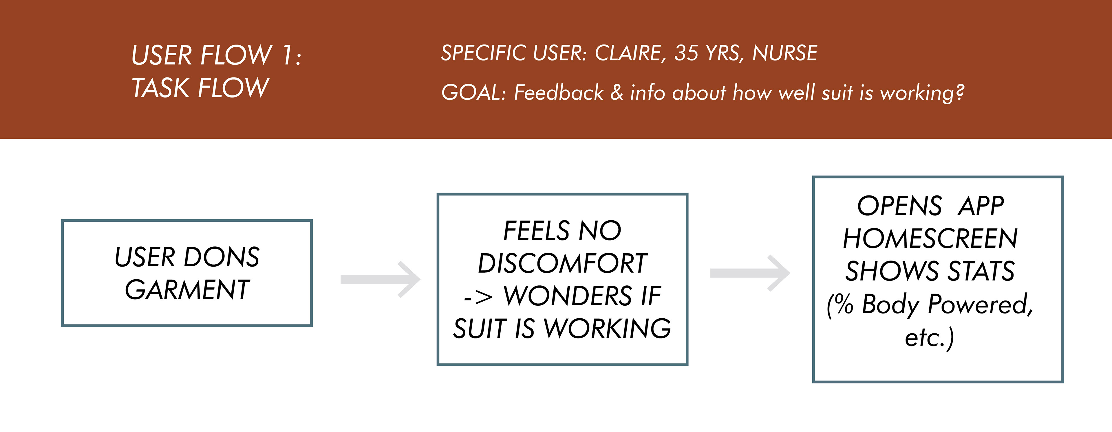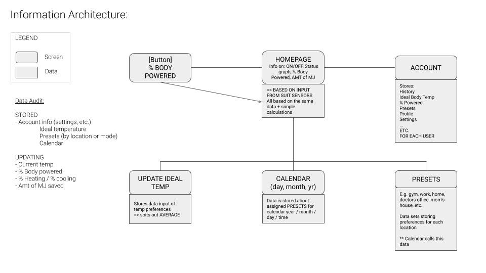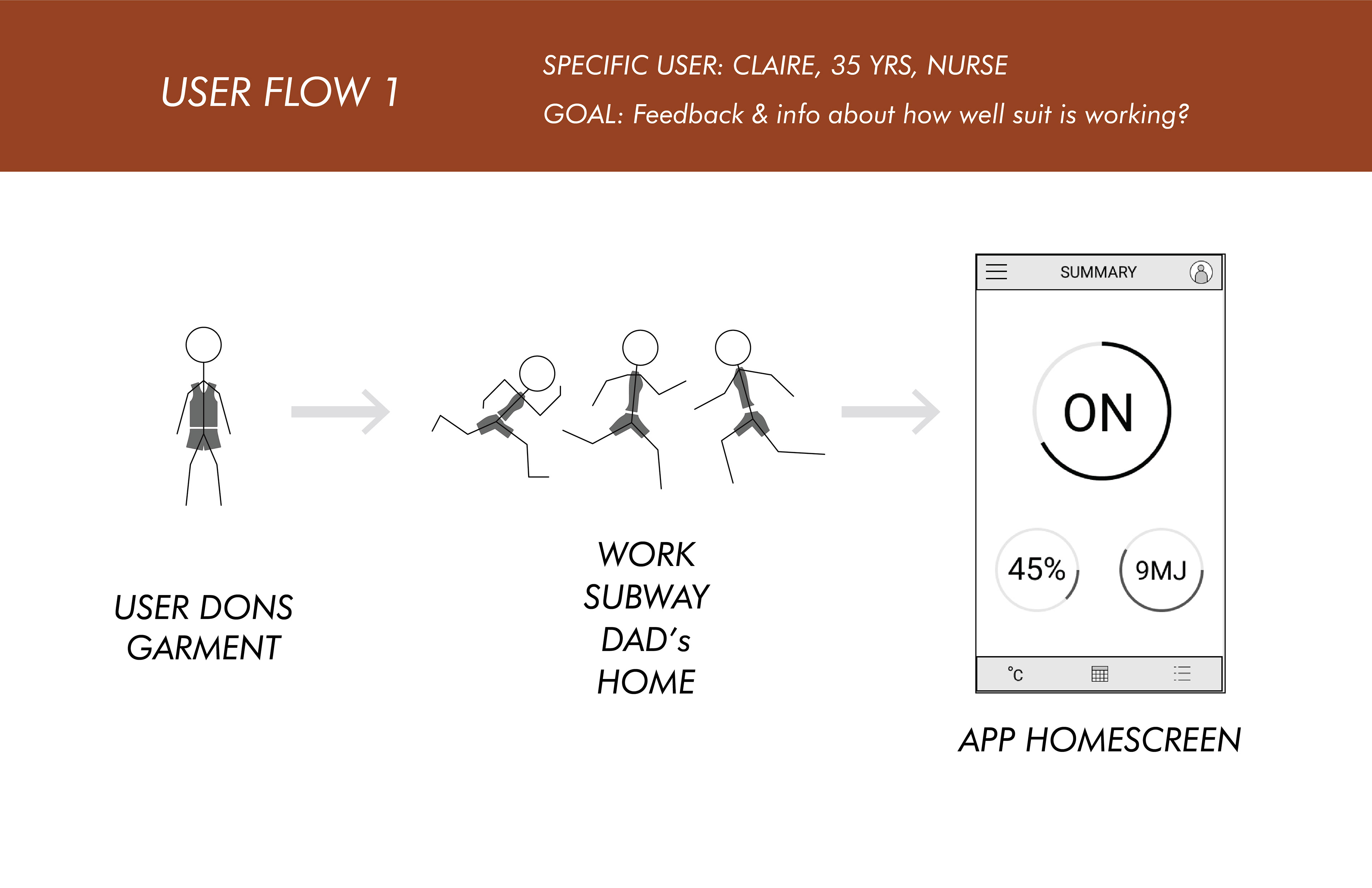 With a temperature sensor embedded in the undergarment and patch system, the application allows users to set their own ideal temperature within the optimal range. Based on this temperature, the suit automatically turns on back-up heaters or coolers if necessary. It gives feedback to let you know how much you are powering the suit yourself. It also collects data to optimize your temperature settings based on your location or assigned presets.